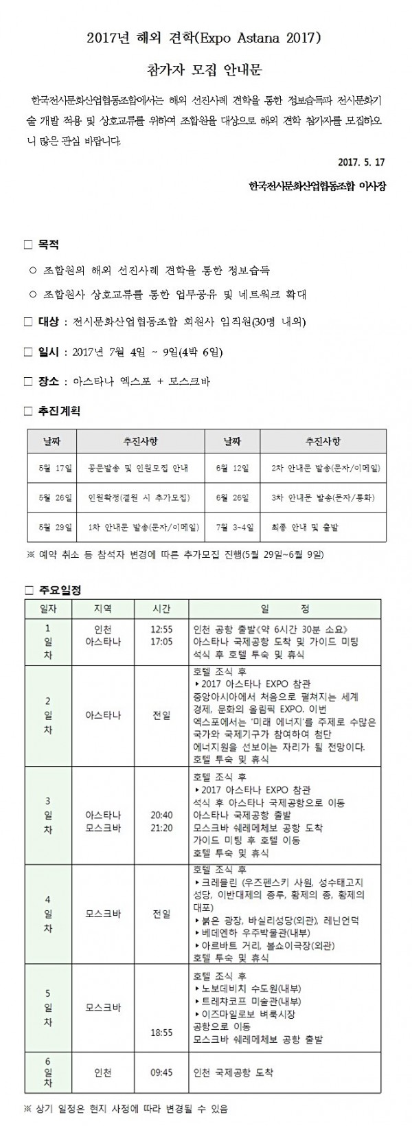 2017년 해외 견학(Expo Astana 2017) 참가자 모집 안내(마감)